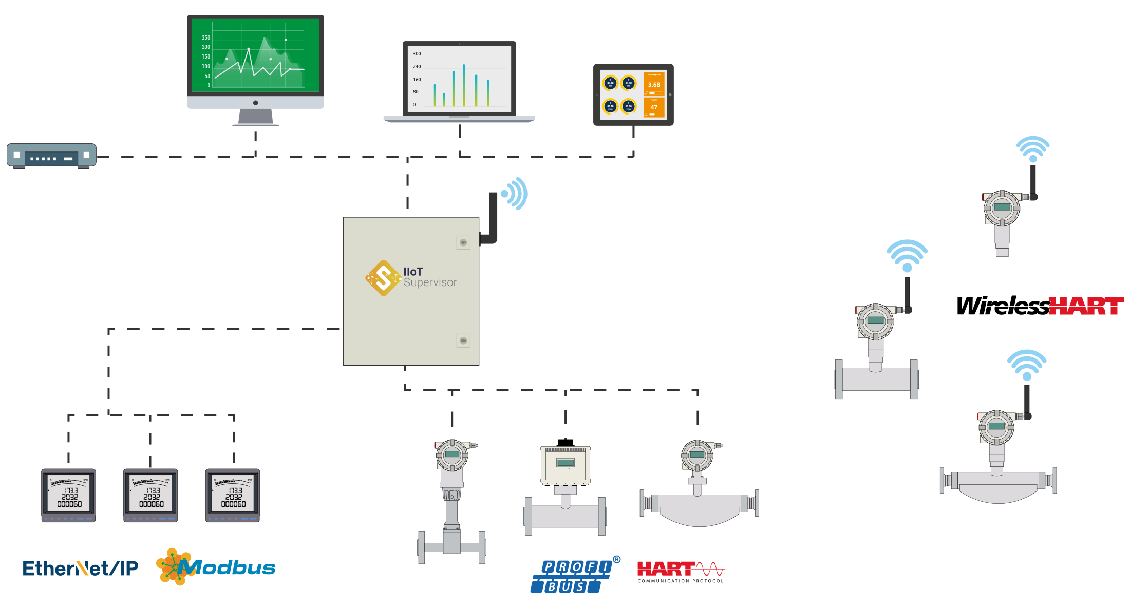El IIoT Supervisor Energy Series ofrece soluciones empaquetadas compatibles con Industria 4.0, ofreciendo a los usuarios herramientas para recolección de datos, provenientes de instrumentos de medición, tales como medidores de agua, aire comprimido, gas natural, energía eléctrica y vapor.
